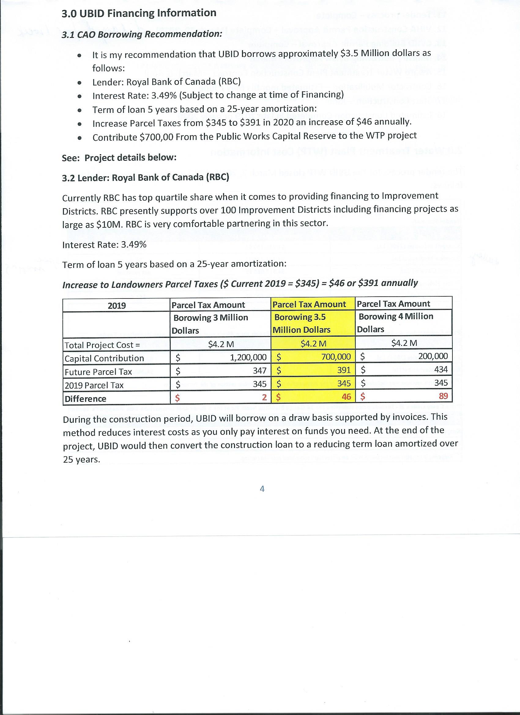 Read the UBID Water Treatment Plant Executive Summary detailing how much we will pay in interest charges. This information is critical to all of you! Landowners are expected to have this information BEFORE they vote on April 9 and April 20 as well as before the Annual General Meeting April 25, 2019. The Summary cost landowners $9000 to produce and when public funds are spent for a report, the report must be released in full