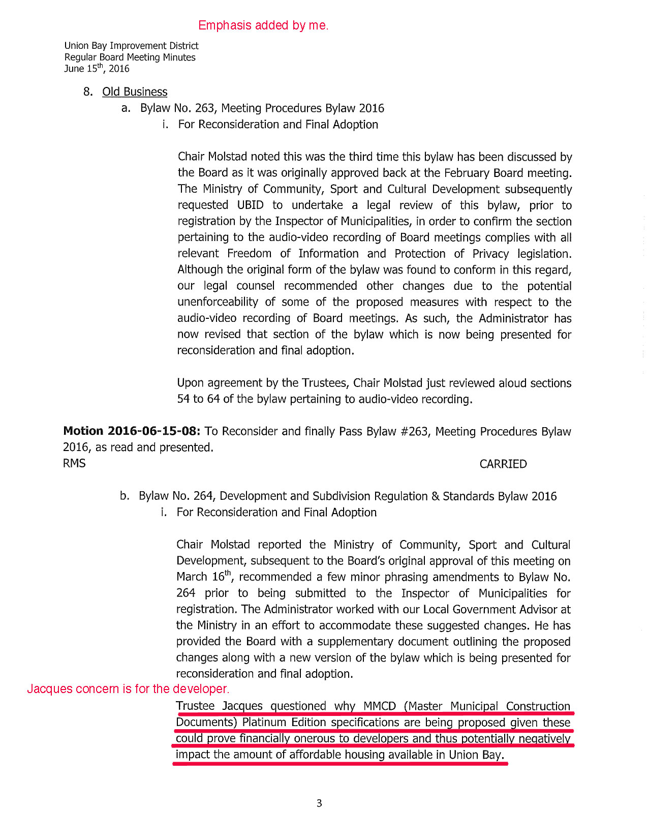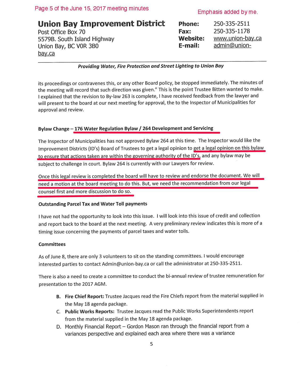 This is what an individual received from a Freedom of Information request regarding Union Bay Improvement District Bylaw 264. NOTE: it took two years to get this information. The first response was insufficient and the individual persisted and received this: https://drive.google.com/file/d/1RetkSslb0a0kiysRGAG6JuGRhhcT60Ny/view It’s a dog’s breakfast so you are going to have to use those brain cells to understand what has transpired. This bylaw was worked on over a 2 year period by the professional Administrator we had (what a loss) because the previous bylaw was so old and out of date – bylaw 176 from 2004 consolidated to bylaw 227 in 2010. https://drive.google.com/file/d/1RetkSslb0a0kiysRGAG6JuGRhhcT60Ny/view
