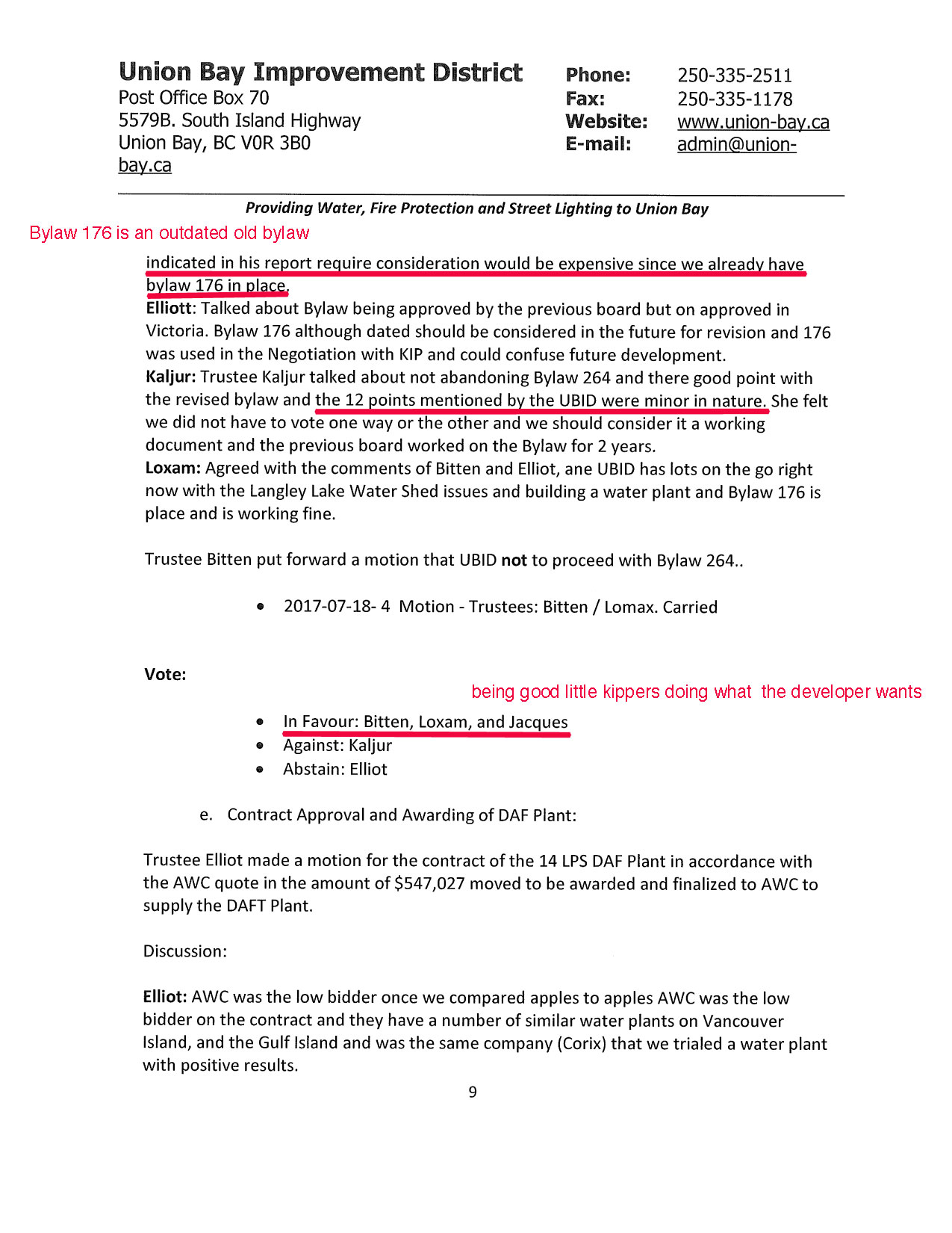 NOTE: The legal opinion regarding Bylaw 264 was received July 12, 2017 from UBID’s lawyer and yet Trustee Kaljur stated she only received it Oct 12, 2017 – the day of the meeting. Another example of this Admin withholding documents from certain Trustees. It’s pretty obvious Kaljur was kept out of the loop since Bitten had his motion ready to kill Bylaw 264. KIP got his flunkies to keep that opinion secret so the new Water Agreement with KIP used the old Bylaw 176. KIP has been running the community since these tools were elected. Fire this Admin!!!