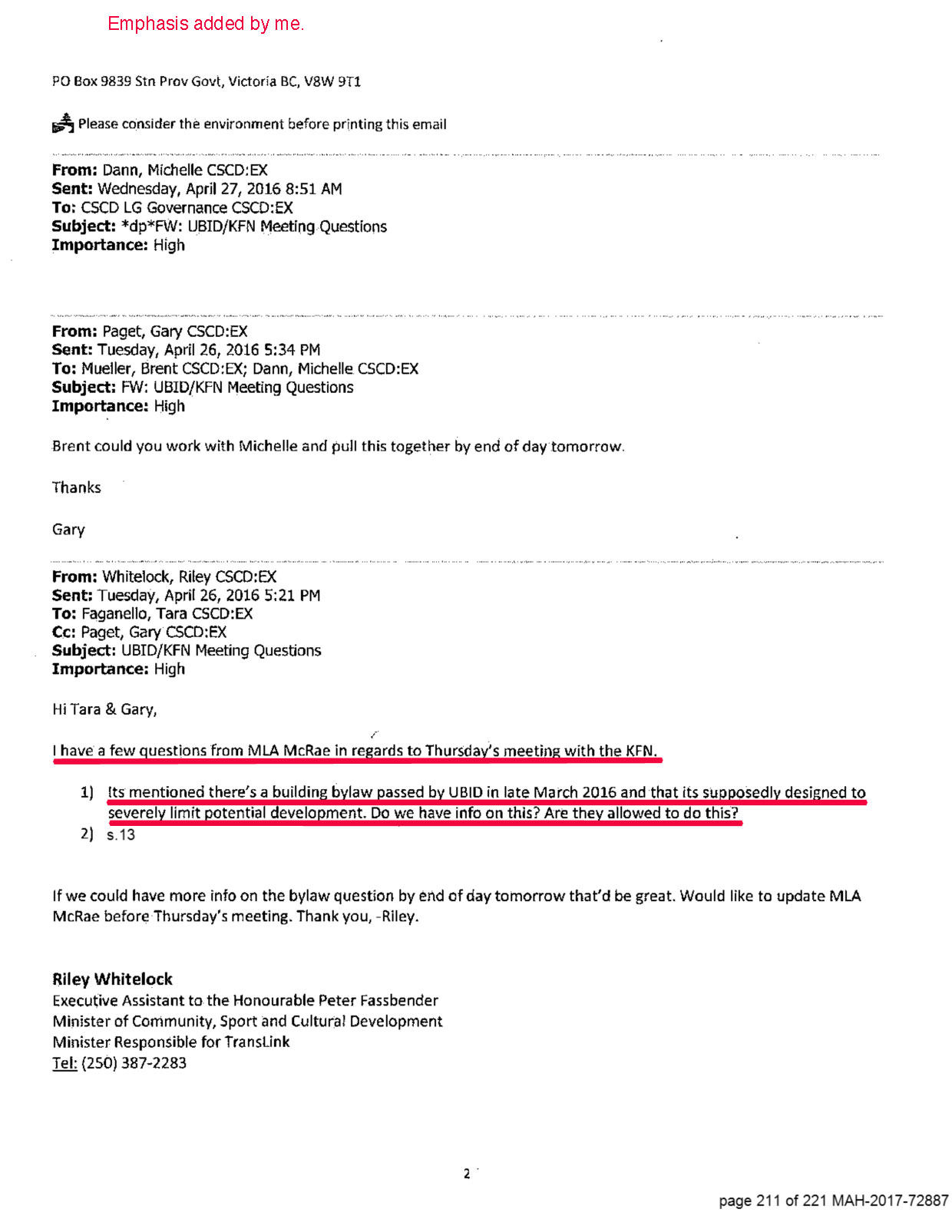 The following 2 pages have been extracted to show the Ministry wanted to know what concerns KIP had with a subdivision bylaw. WTF? Another example of the dirty backroom deals in favour of this sleazy developer by the Liberal Government – and those people are still there. Faganello, Mueller, etc. with their fingers on the scales in favour of KIP. Look at the bullet points for answers to be given when questions are asked.