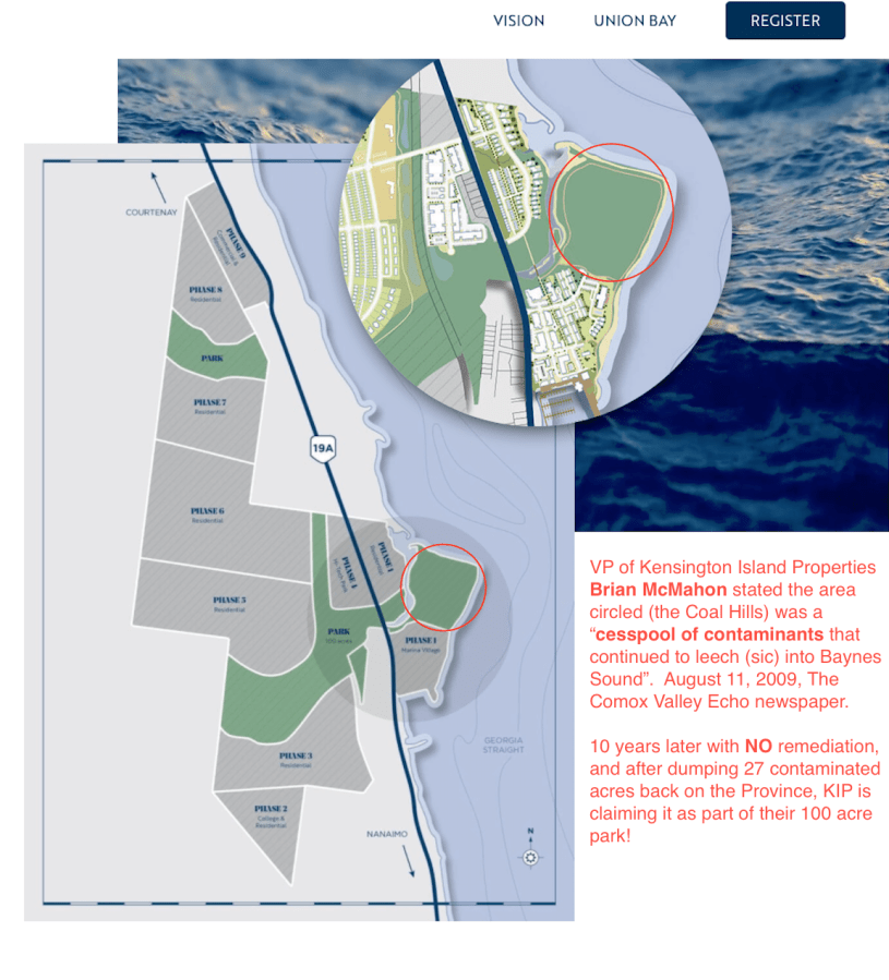 What is the plan for the “…cesspool of contaminants that continued to leech (sic) into Baynes Sound” according to KIP/Union Bay Estates VP, Brian McMahon?