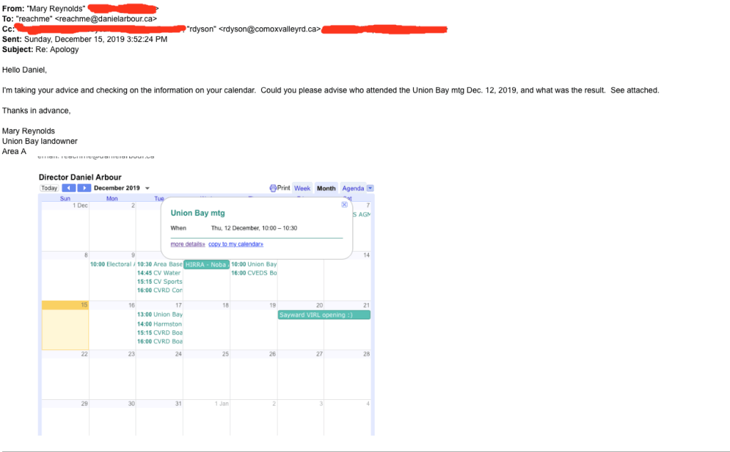 So according to Arbour’s calendar, which we know is unreliable because of his hissy fit when I and other landowners relied on it in Dec., he is attending the Union Bay Community Club’s Annual General Meeting tomorrow night at 7 pm. Maybe he’s just attending and not speaking.