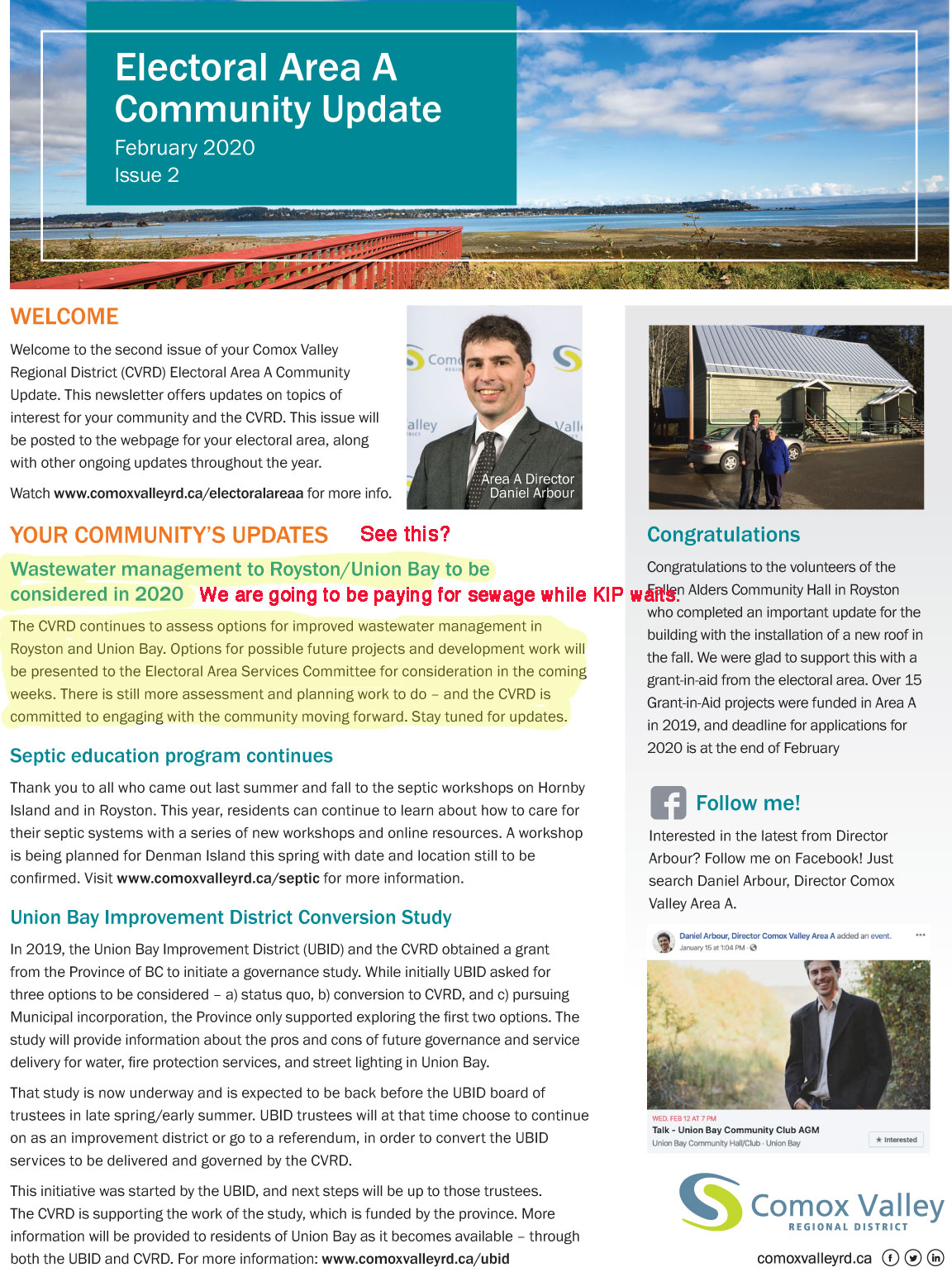 Note the wastewater management? Emphasis added by me. The Electoral Area Services Committee will be presented with possible options in the coming weeks. What are they going to saddle us with? What is sleazy (in my opinion) KIP planning?
