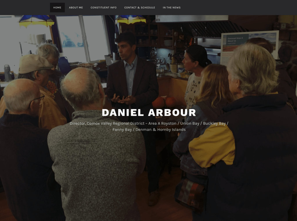 Here’s the main page on his webpage – geezuz it’s a picture from the market! Look how many people can fit in to that confined space. This is the best he can do? This is the picture he chose to show him engaged with the community? https://danielarbour.ca