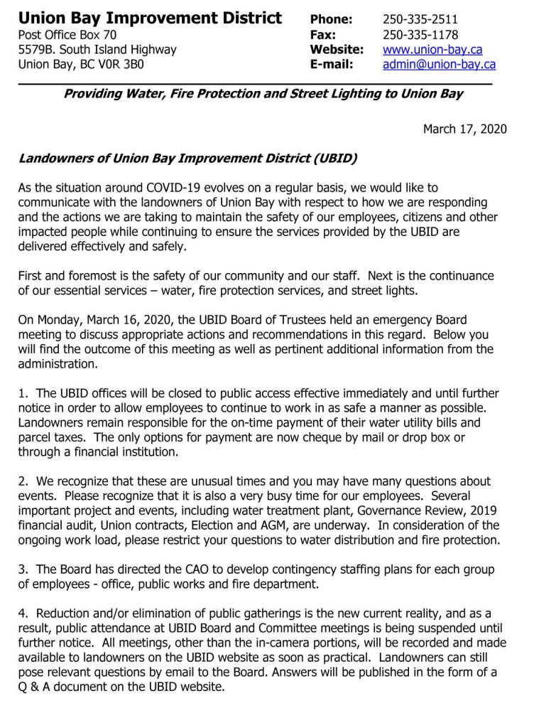UBID Union Bay Improvement District and Covid 19 Date: March 17, 2020Author: allthingsunionbay 0 Comments Share this: Click to share on X (Opens in new window) X Click to email a link to a friend (Opens in new window) Email Click to share on Facebook (Opens in new window) Facebook Click to print (Opens in new window) Print Like Loading...