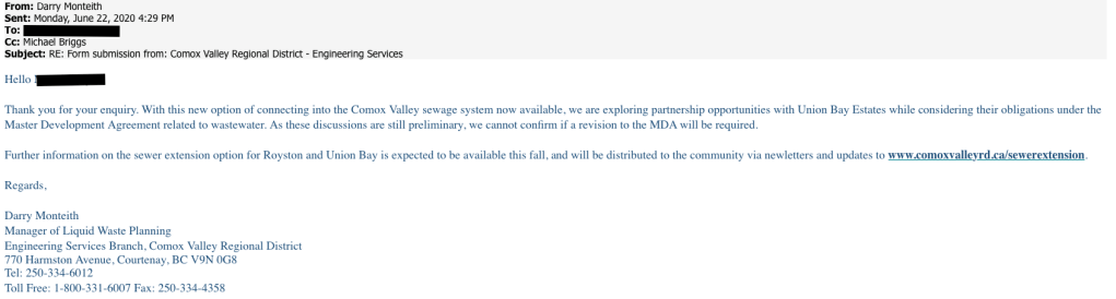 The sort of answer. I can’t believe the CVRD thinks they can trust this developer to follow through on anything! There is a long history of promises broken, reduced, rescinded.