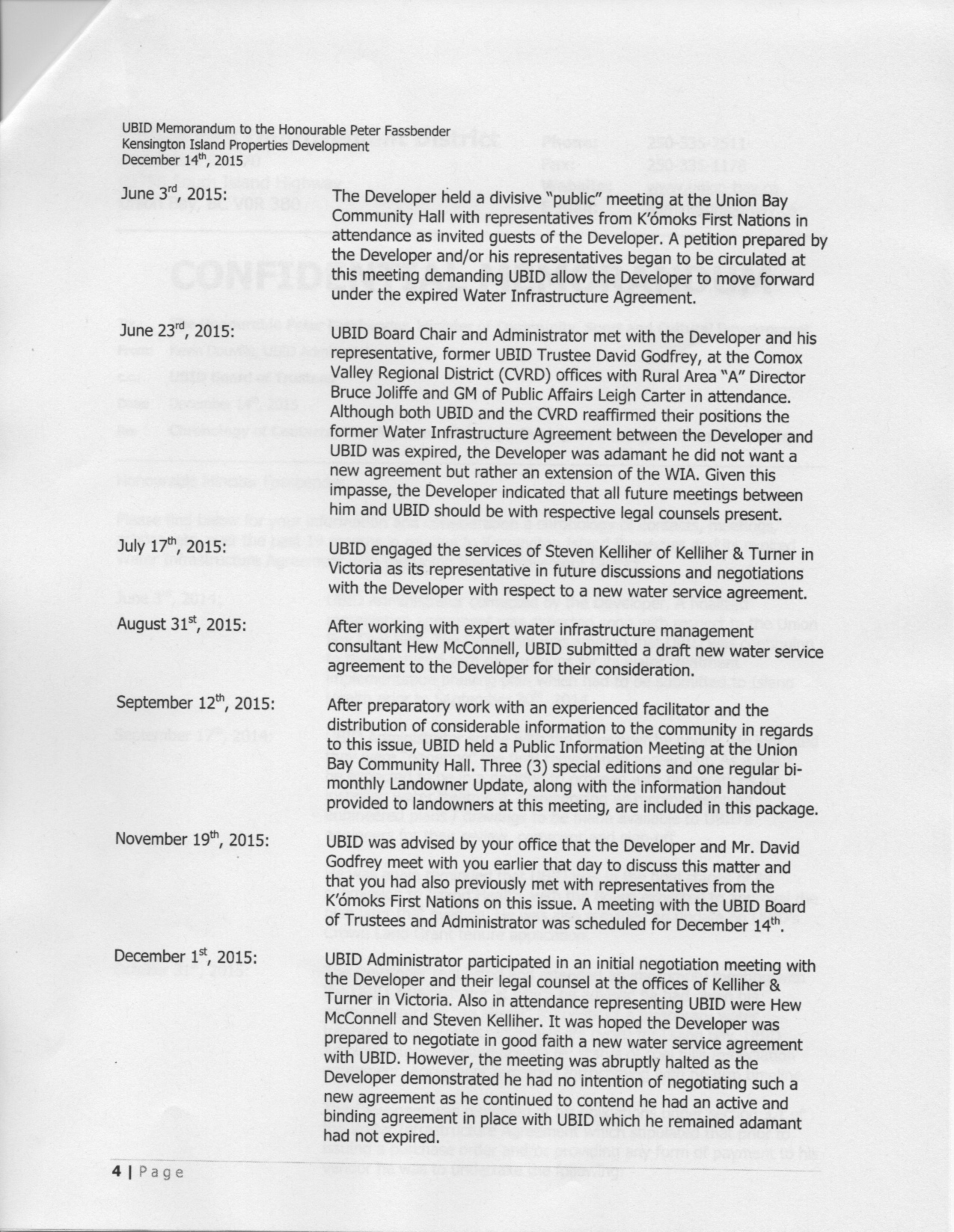 Godfrey then added a brand new twist in his response to Anne Alcock. Godfrey said if anyone is to blame for the school fiasco it’s the board Anne was on. Get this – Godfrey claims the Ministry/Provincial Gov’t told the Board NOT to tell the landowners that we didn’t own the school property with clear title when they learned of the covenant. Godfrey blames the Molstad board for making it public and somehow that prevented it from being resolved and he is still crying about it. I call bullshit on this whopper. Excerpt of Correspondence sent to Union Bay Improvement District from Minister Bill Bennett dated Oct. 6, 2009. Mentions School Property problem. The Molstad board took over in April 2011, and yet we still didn’t own the property. Godfrey needs to provide evidence UBID was instructed NOT to advise the landowners. Godfrey’s board knew the zoning and limitations on the property at the time of purchase.