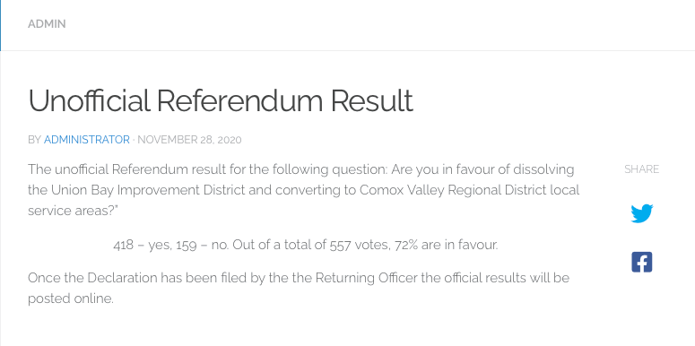 Conversion, UBID Good Bye Union Bay Improvement District. Good Riddance! Date: November 28, 2020Author: allthingsunionbay 0 Comments 72% voted for Conversion!!!! 418 YES159 No https://union-bay.ca/unofficial-referendum-result/ Share this: Click to share on X (Opens in new window) X Click to email a link to a friend (Opens in new window) Email Click to share on Facebook (Opens in new window) Facebook Click to print (Opens in new window) Print Like Loading...