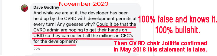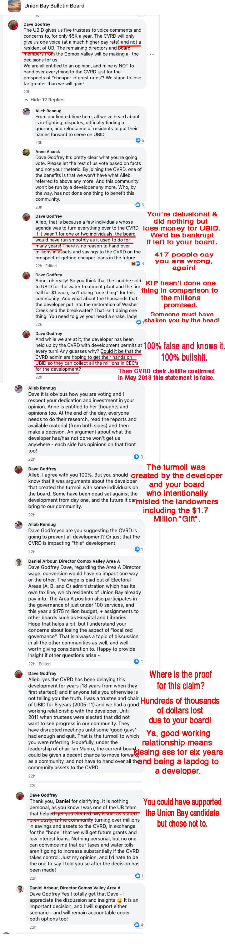 It didn’t stop Godfrey from spewing the same bullshit in 2020, hoping to influence and discourage landowners from voting for conversion. It’s what you would expect from a KIP representative as it’s no secret KIP never wanted Union Bay to become a service area of the CVRD – wanted to keep the hillbillies under his control.
