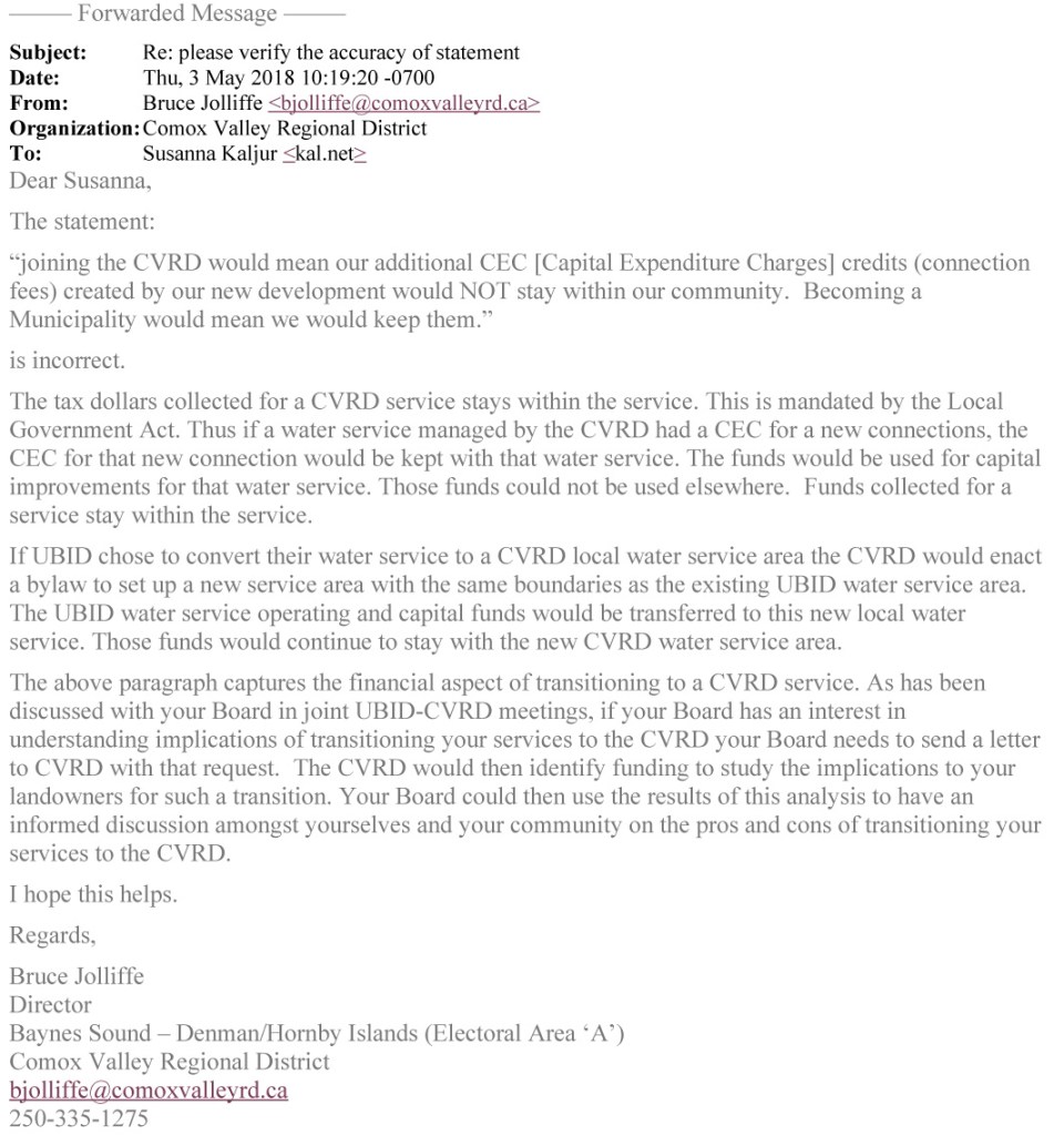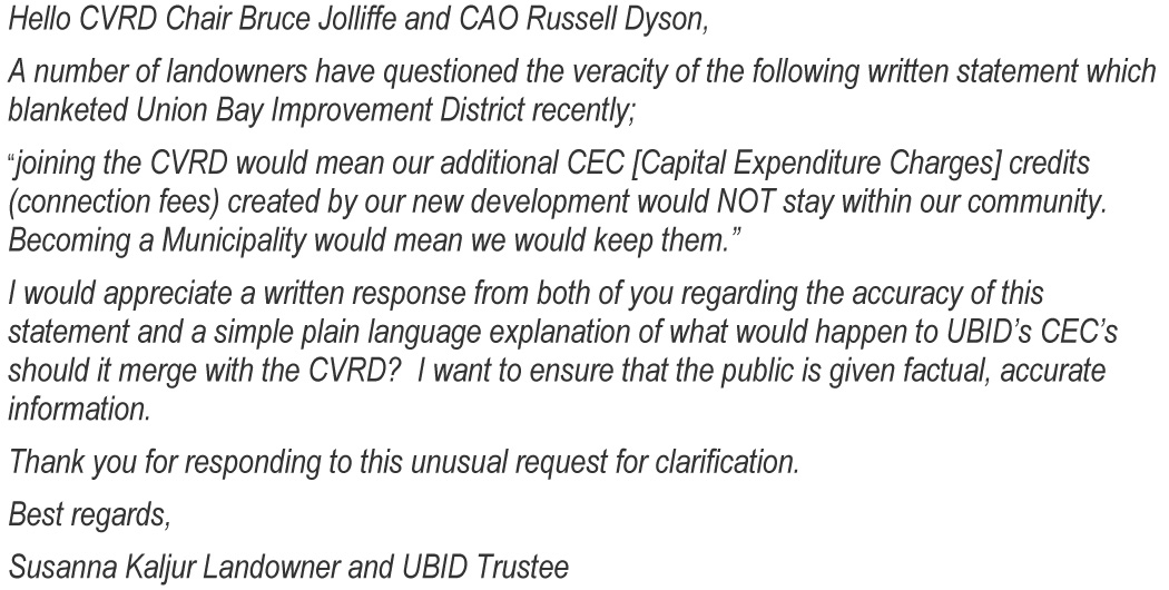 See the red below? Trustee Kaljur contacted Chair of the CVRD, Bruce Jolliffe who stated very clearly the CEC’s stay in Union Bay.