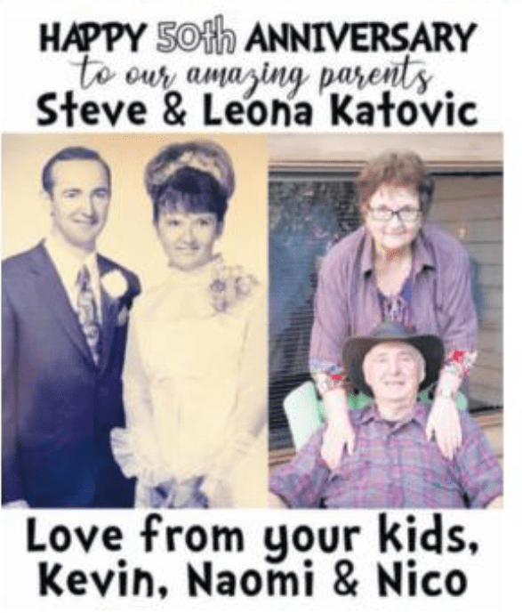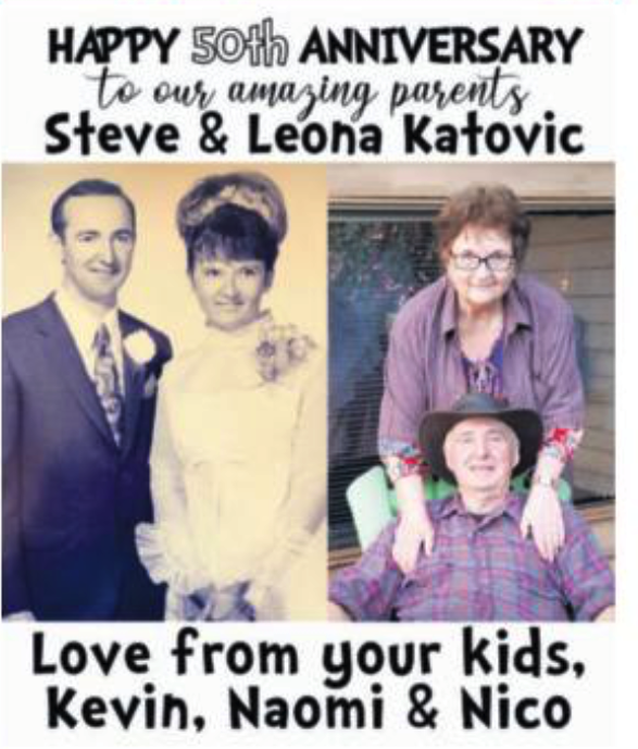 Uncategorized Happy 50th Anniversary to Steve and Leona Katovic! Date: December 12, 2020Author: allthingsunionbay 1 Comment Wow! Congratulations on 50 happy years. Two of the nicest people you will ever meet. Picture appeared in the Record Dec. 9, 2020 Share this: Click to share on X (Opens in new window) X Click to email a link to a friend (Opens in new window) Email Click to share on Facebook (Opens in new window) Facebook Click to print (Opens in new window) Print Like Loading...