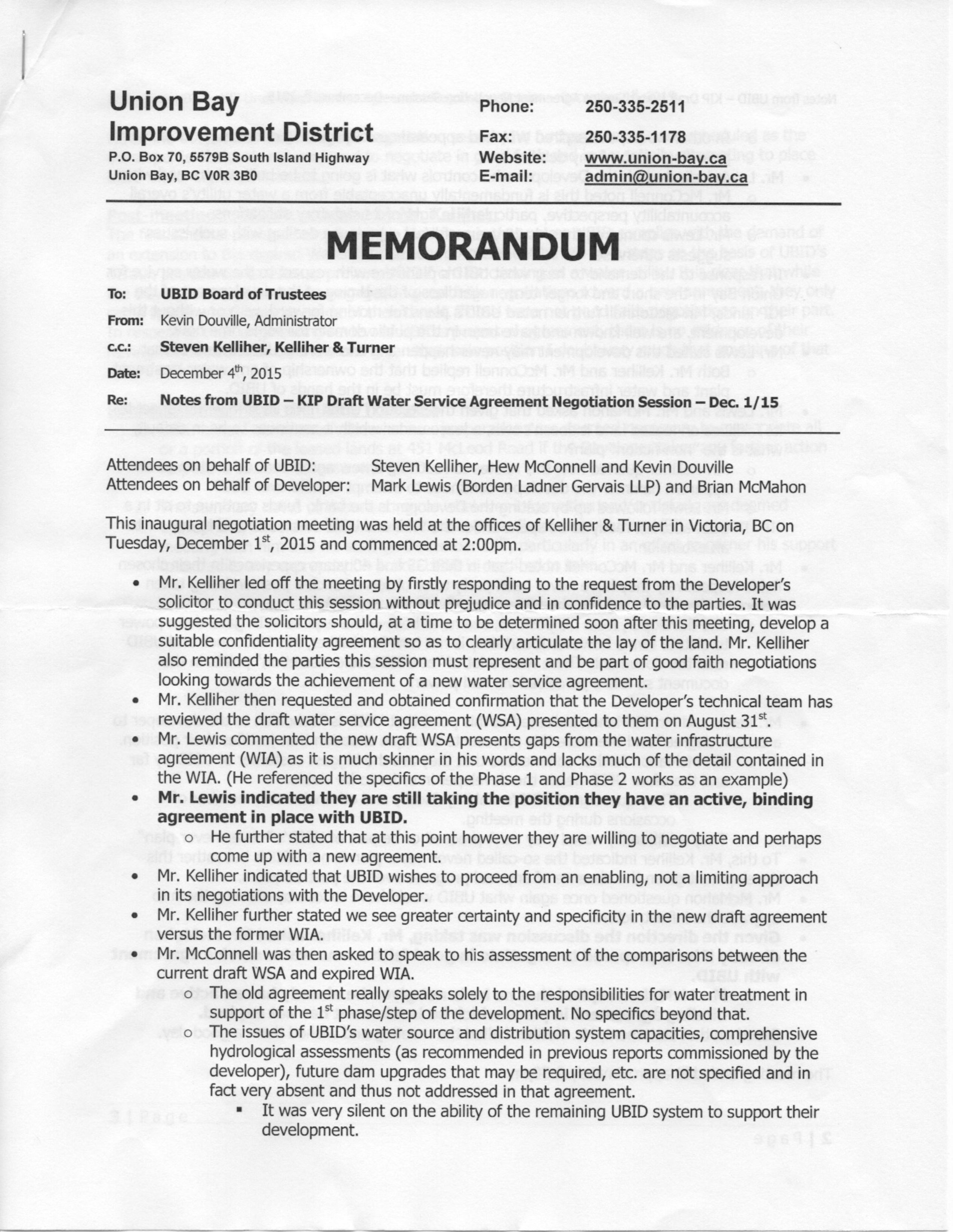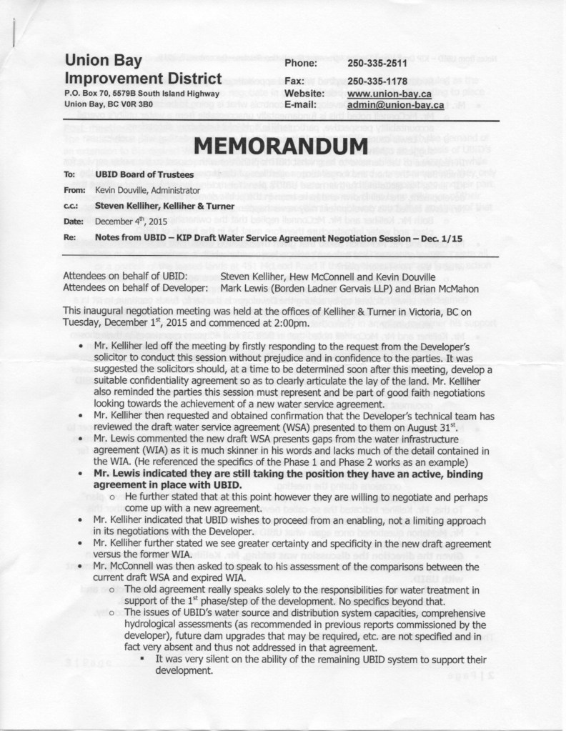 The 2 experts hired by UBID along with UBID’s Administrator met with KIP and his counsel Mark Lewis at a planned meeting Dec. 1, 2015 to negotiate a new water agreement. The trustees did not attend the meeting as they had hired the experts and UBID’s knowledgable Admin were all that was required.