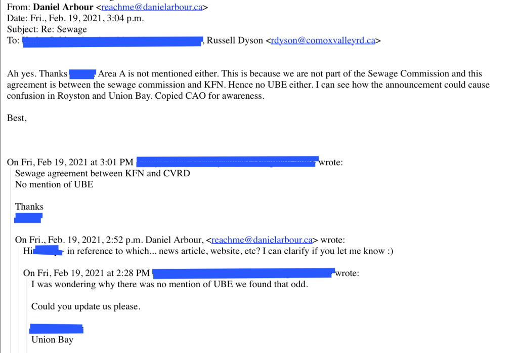 A fellow landowner forwarded this info from Area A Director Daniel Arbour. The agreement reported in The Record was between the sewage commission and KFN only. https://www.comoxvalleyrecord.com/news/comox-valley-regional-district-kmoks-first-nation-ratify-sewage-solution/