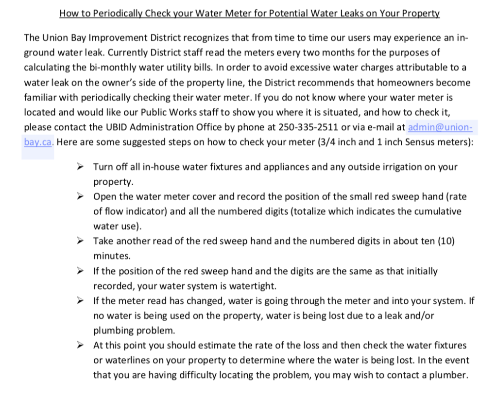 UBID published this ‘how to’ in order to help landowners avoid astronomical water bills due to a leak. There is no longer a policy of a one time forgiveness. https://drive.google.com/file/d/1qv2zw81DwsP7NUYjCvvgFa4zzykcVE7f/view