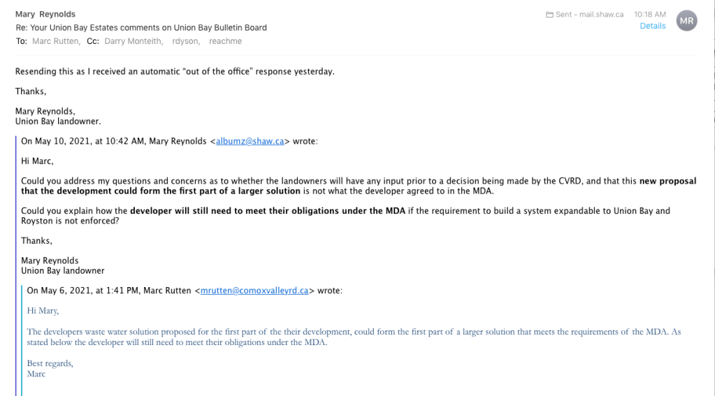 As the months pass, the CVRD’s wording and justification for allowing KIP/UBE to install a sewage system exclusively for phase one, once again demonstrates the ability of this developer to renege on agreements and screw Union Bay landowners.