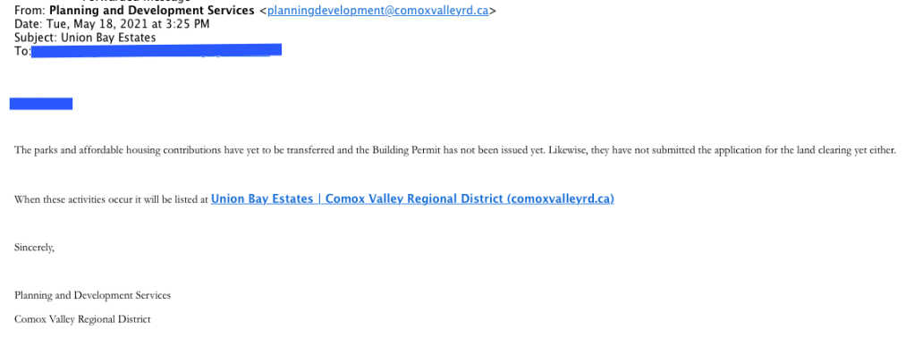 Email received today by an individual who has been asking about the building permit for the Discovery Centre, the 6 affordable housing lots required and the turning over of the parks and trails as well as the permit for the clearing above. Ole slick hasn’t done any of it.