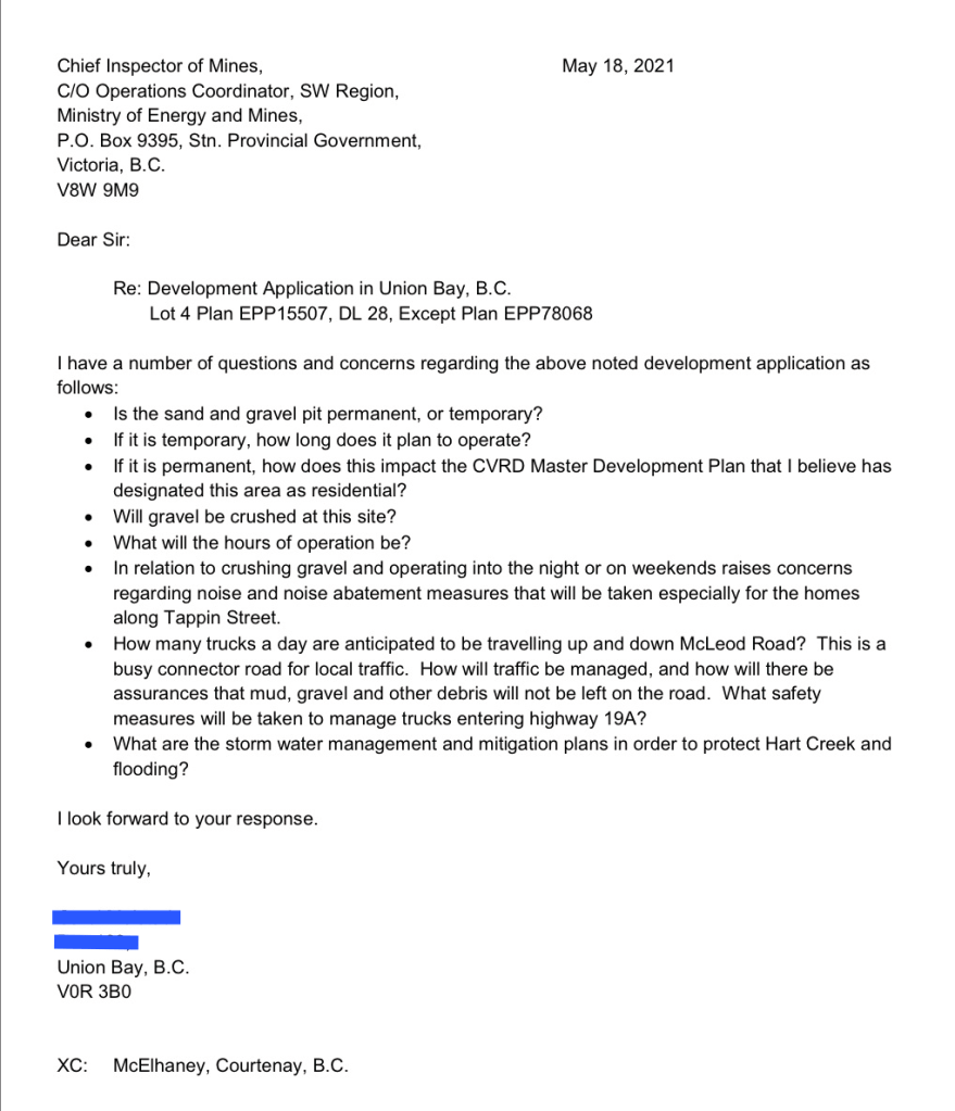 A fellow landowner sent me a copy of the letter they sent to the Inspector of Mines and allowed me to publish it.