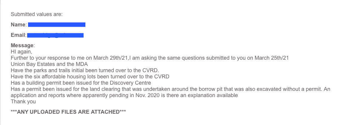 Email received today by an individual who has been asking about the building permit for the Discovery Centre, the 6 affordable housing lots required and the turning over of the parks and trails as well as the permit for the clearing above. Ole slick hasn’t done any of it.