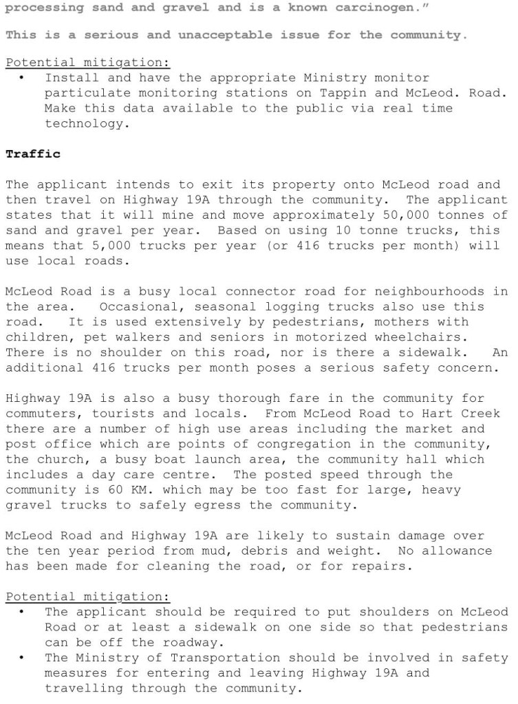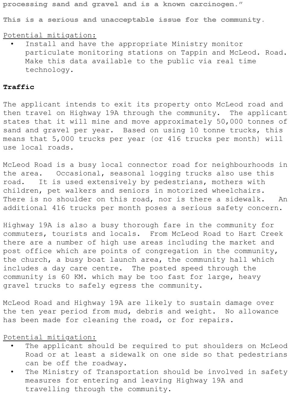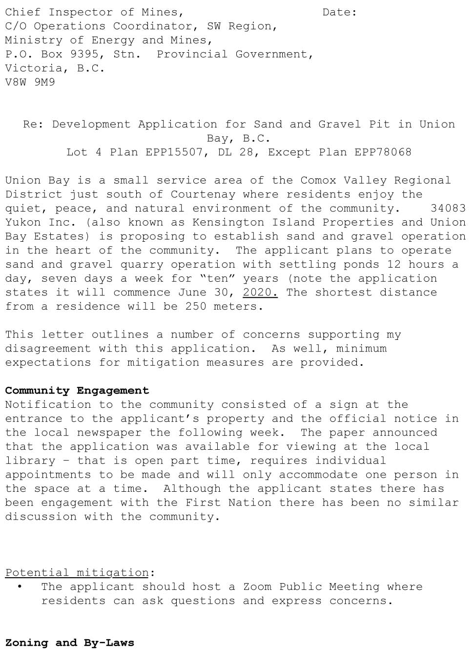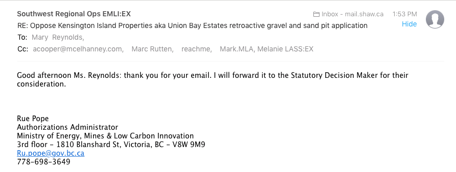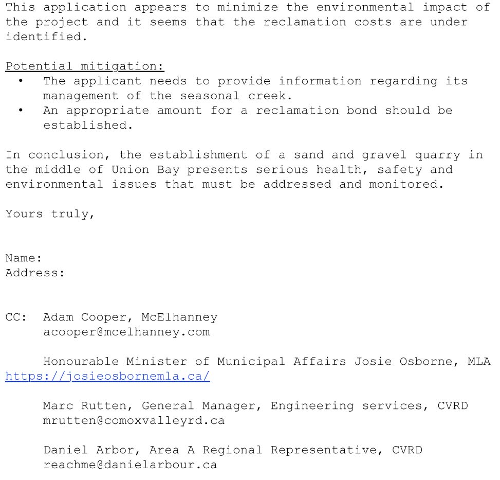 EDIT May 26, 2021: I submitted my opposition by email to: SouthwestMinesDivision@gov.bc.ca which was posted in the ad in the Record, and cc’d acooper@mcelhanney.com mrutten@comoxvalleyrd.ca reachme@danielarbour.ca Melanie.Mark.MLA@leg.bc.ca today and received a confirmation from Rue Pope, Authorizations Administrator, Ministry of Entry, Mines & Low Carbon Innovation.