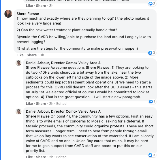 Have to give Area A Director Daniel Arbour credit for alerting the landowners to this proposed logging in the watershed. We paid over $5 million for a water treatment plant, and how is it going to handle the effects logging will have on what goes into the lake?