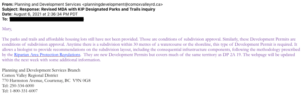 Received this response from “anonymous” at the CVRD in a stand alone response to my question. If the webpage was updated regularly I wouldn’t have to send emails asking what’s going on. As it is, there is very little information regarding this development on the CVRD website.