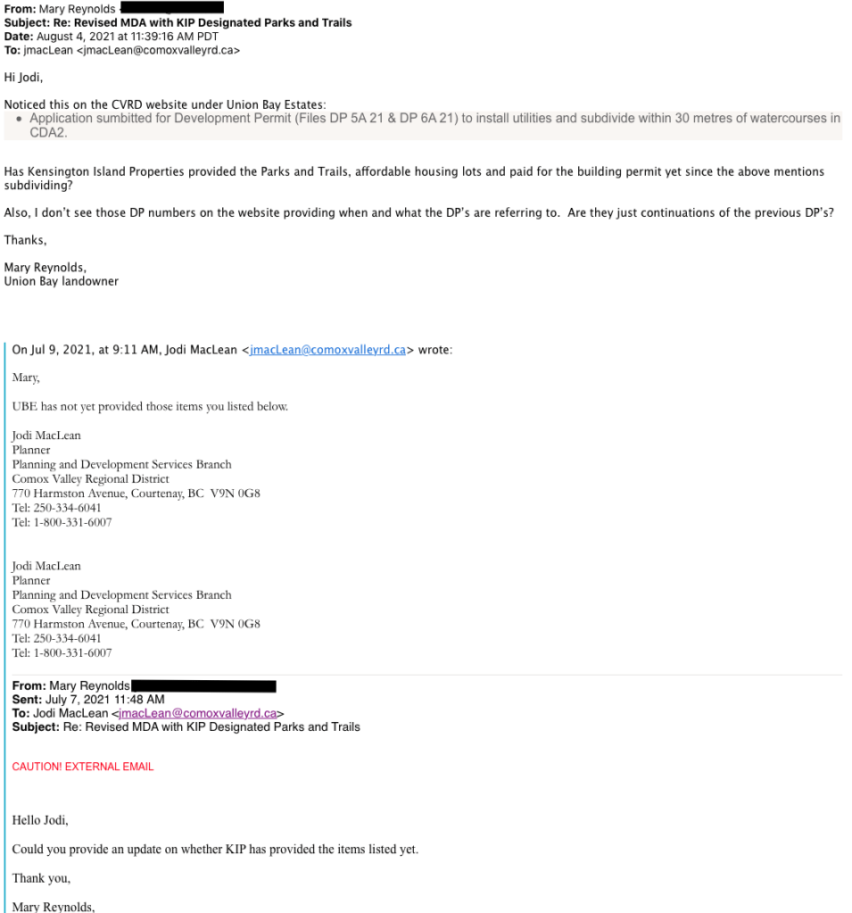 Sent another email to Jodi Maclean at the CVRD asking about parks and trails, affordable housing, building permit fee and new DP numbers on CVRD website under Union Bay Estates.