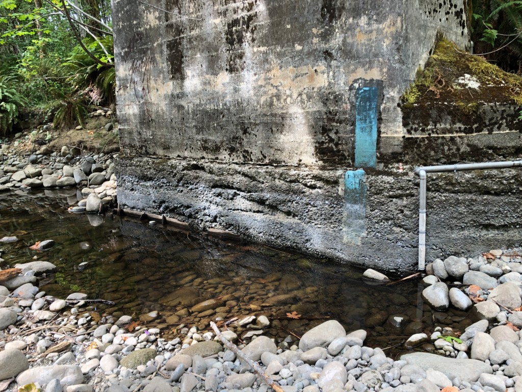 1875 cubic metres of treated sewage dumped into Hart/Washer Creek daily except for summer months. Notice KIP’s pipe collecting data in the deepest part where the creek narrows under the trestle.