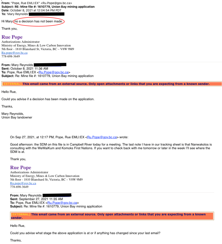 Guess KIP hasn’t provided the information requested by the SDM last week. https://allthingsunionbay.com/2021/09/29/update-on-kensington-island-properties-aka-union-bay-estates-retroactive-gravel-sand-pit-application-waiting-for-information-from-the-proponent/