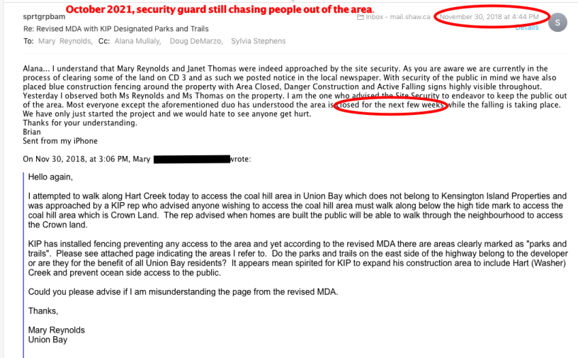 Kip’s security is busy chasing people off the property who are accessing the coal hills. Ole slick claimed it was only for a few weeks back in Nov. of 2018. Noticed this on the Union Bay Bulletin Board today.