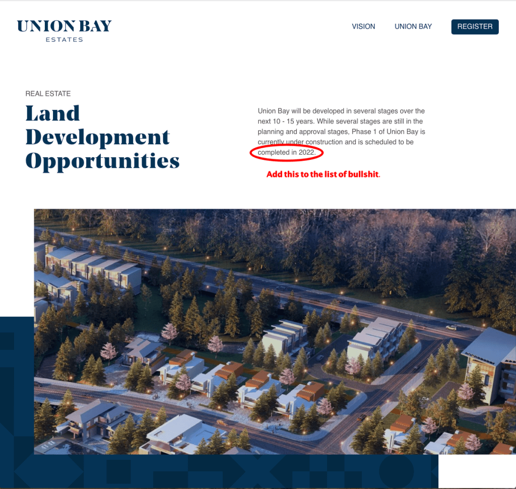 Kensington Coastal Pointe, Kensington Island Properties aka KIP Costanza, 34083 Yukon Inc., Kensington Union Bay Properties Gp Ltd, The Union Bay Community, Union Bay Estates, Union Bay Resorts Kensington Island Properties aka Union Bay Estates – Bullshit on 2022 Completion – Typical Date: July 12, 2022Author: allthingsunionbay 0 Comments https://unionbayestates.com/ Share this: Click to share on X (Opens in new window) X Click to email a link to a friend (Opens in new window) Email Click to share on Facebook (Opens in new window) Facebook Click to print (Opens in new window) Print Like Loading...