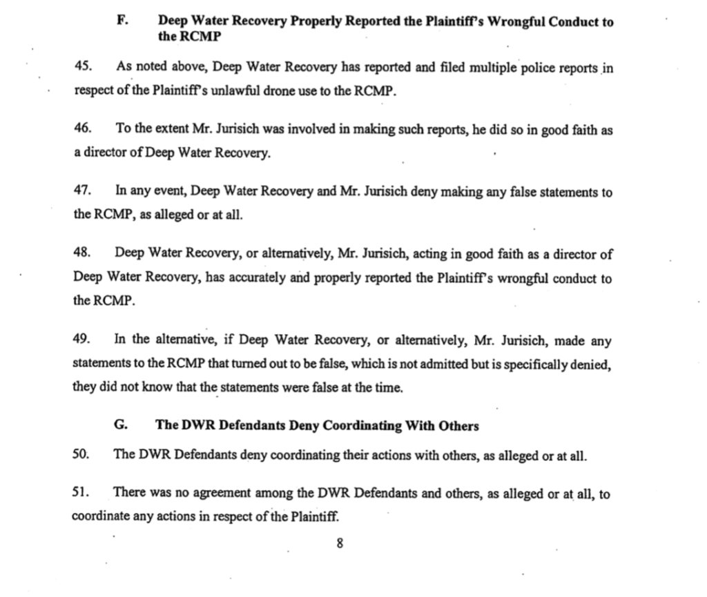 Page 8 of the RCC (Response to Civil Claim) “…filed multiple police reports in respect of the Plaintiff’s unlawful drone use to the RCMP.” So why didn’t Jurisich leave it to the police to handle? Was he made a special constable of the RCMP? Since when is it acceptable to take the law into your own hands and justify it by claiming he was provoked? How ridiculous – these incidents weren’t spontaneous – Jurisich sought me out to rob me and physically intimidate. All the BS in the world doesn’t change the facts.