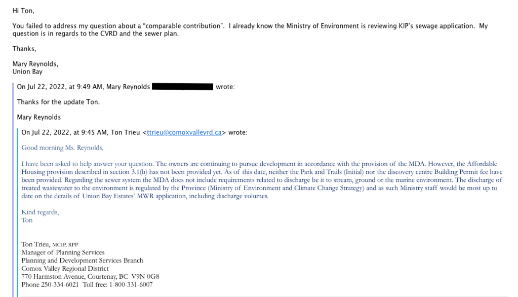 I hope Ton Trieu answers the “comparable contribution” by KIP if sewer extension comes south. KIP and KFN developments are going to dwarf existing Union Bay and should be paying a hell of a lot – existing owners shouldn’t. It’s those developing huge swaths of land that require the sewer – existing landowners can install new septic systems, probably cheaper than what we will be presented with.