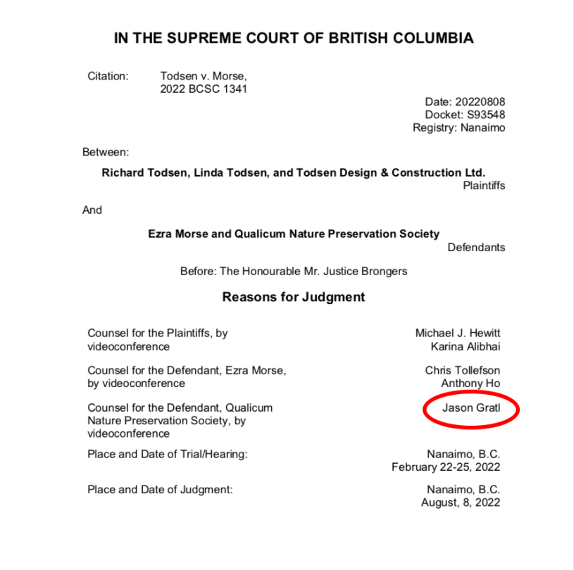 In May 2021, Richard Todsen and Linda Todsen, owners of Todsen Design and Construction, filed a claim alleging Morse was misleading in his outspoken advocacy against the project and damaged their company’s reputation. In the court decision, Justice Jan Brongers concluded that statements made by Morse and the Qualicum Nature Preservation Society were an “expression on a matter of public interest” and they had a viable defence to the defamation allegations.