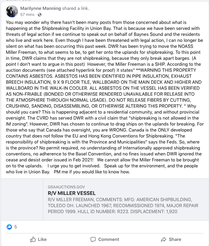 Some CCOBS members received cease and desist letters demanding conditions be met or face a lawsuit. That’s why they removed all their postings and their Facebook page about Deep Water Recovery Ship breaking. They were bullied through DWR lawyers and also physically bullied by Jurisich.