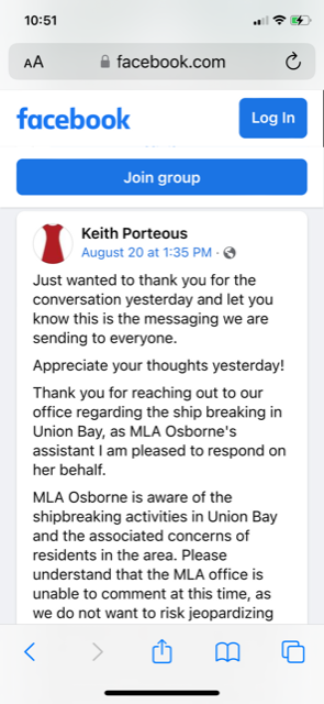 Some screenshots from this past week on Facebook Union Bay Bulletin Board discussing the Ship Breaking by Deep Water Recovery.