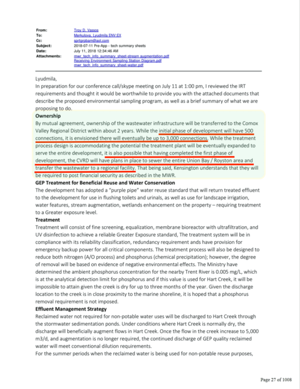 The MDA stipulates the developer is to build a sewage system that is expandable allowing Union Bay and Royston landowners to hook up at the landowners cost to add on to that system. The developer obviously had no intention of abiding by the terms of the MDA which he signed a revised version Dec. 2017, (with no changes regarding sewage) because within 2 months had submitted an application to dump sewage into Hart Creek. How can anyone trust this developer?
