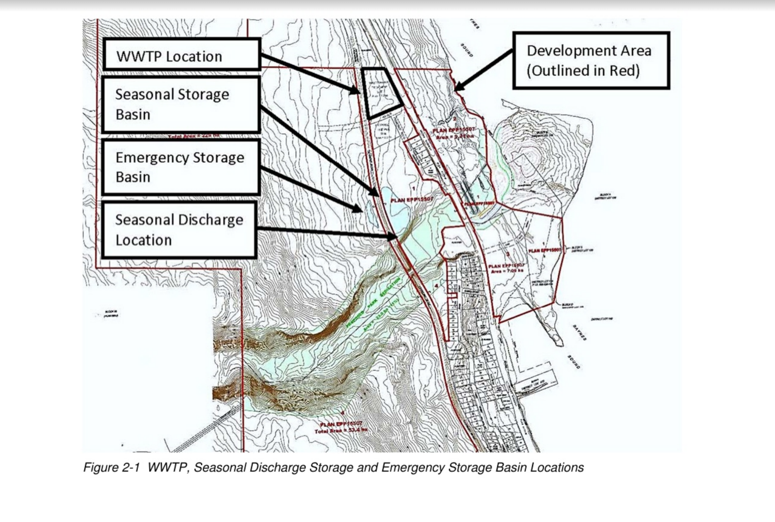 The diagram below was submitted as part of the package when KIP applied in Feb. 2018, to dump treated sewage into Hart Creek from October through May yearly. The Waste Water Treatment Plant Location is clearly marked with Seasonal Storage Basins for the 4 months when the treated sewage can’t be dumped into Hart Creek. The application is still under review.