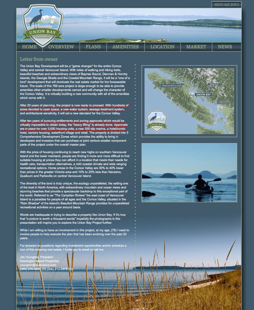 The image in the header is from when KIP called itself the Union Bay Community and you know how many years ago that was. Look what KIP President said then after “20 years of planning…” blah blah The ever changing timeline and dogs breakfast of plans.