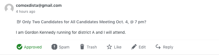 UPDATE: Oct. 1, @6:38 pm. Received this in my comments from Gordon Kennedy confirming he will be attending the All Candidates Meeting Oct. 4 @ 7 pm.