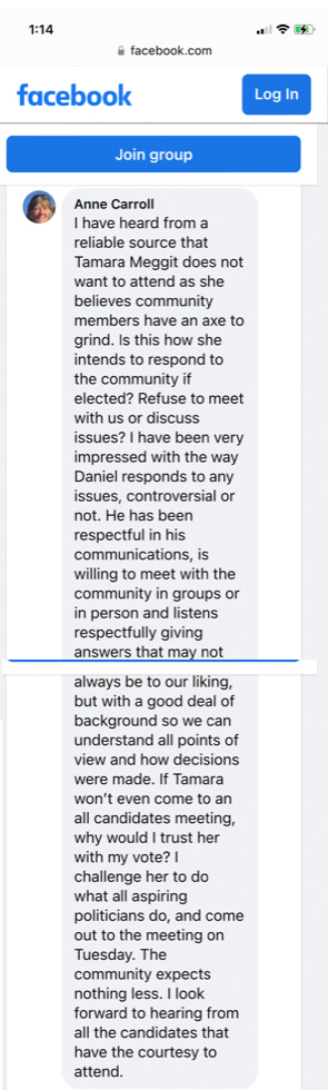 Is Tamara Meggitt actually claiming she won’t attend because she believes community members have an axe to grind. Gee, if there are problems and axes to grind, isn’t that the time to state how you will improve constituents lives?