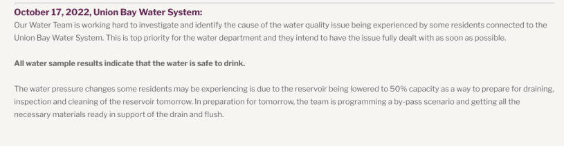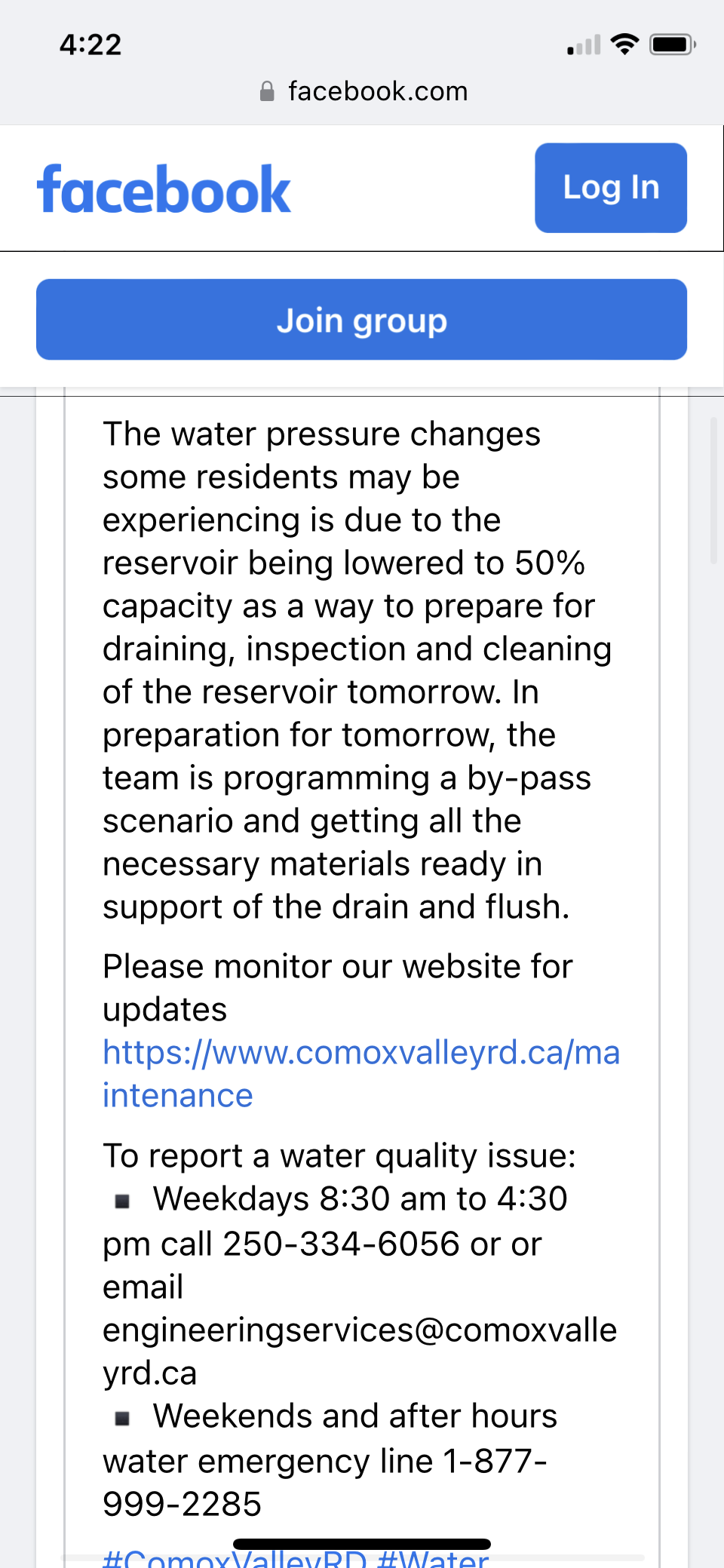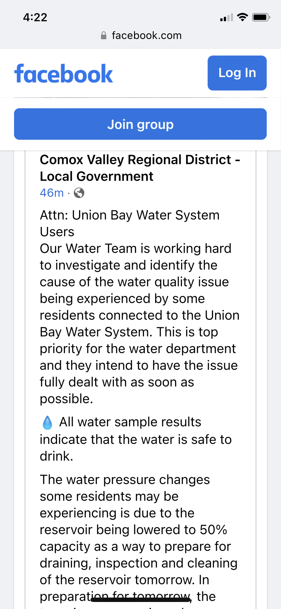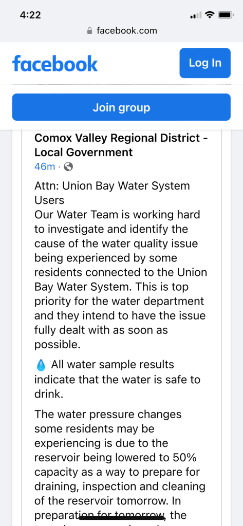 CVRD CVRD Responds to Water Issues in Union Bay Date: October 17, 2022Author: allthingsunionbay 0 Comments Lots of complaints about the colour and pressure. https://www.comoxvalleyrd.ca/maintenance Share this: Click to share on X (Opens in new window) X Click to email a link to a friend (Opens in new window) Email Click to share on Facebook (Opens in new window) Facebook Click to print (Opens in new window) Print Like Loading...