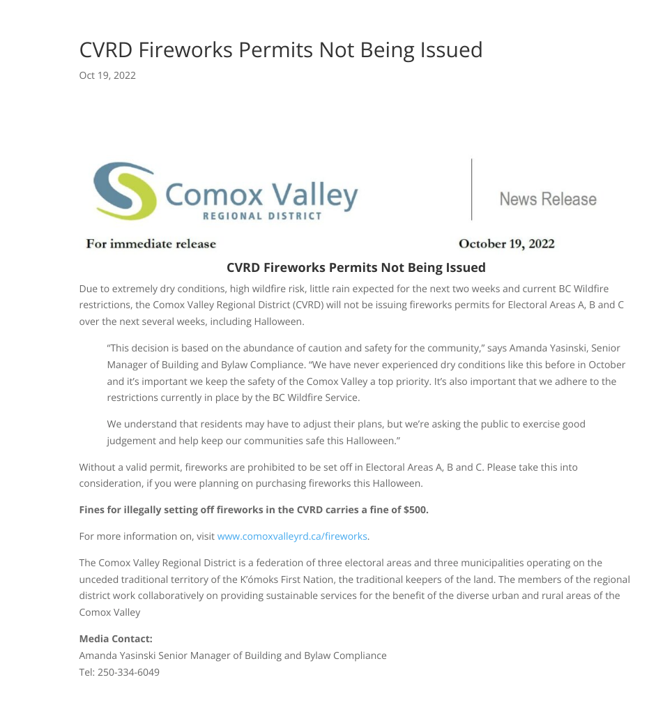 CVRD CVRD Fireworks Permits NOT Being Issued – $500. Fine Date: October 19, 2022Author: allthingsunionbay 0 Comments https://unionbayfirerescue.ca/2022/10/19/cvrd-fireworks-permits-not-being-issued/?utm_source=mailpoet&utm_medium=email&utm_campaign=the-last-newsletter-total-posts-from-our-blog_1 Share this: Click to share on X (Opens in new window) X Click to email a link to a friend (Opens in new window) Email Click to share on Facebook (Opens in new window) Facebook Click to print (Opens in new window) Print Like Loading...