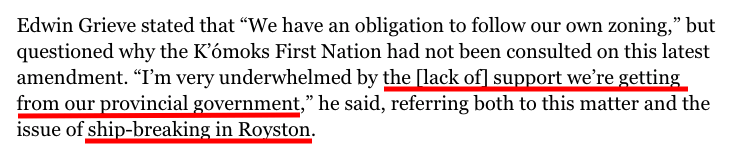 Edwin Grieve stated that “We have an obligation to follow our own zoning,” but questioned why the K’ómoks First Nation had not been consulted on this latest amendment. “I’m very underwhelmed by the [lack of] support we’re getting from our provincial government,” he said, referring both to this matter and the issue of ship-breaking in Royston.