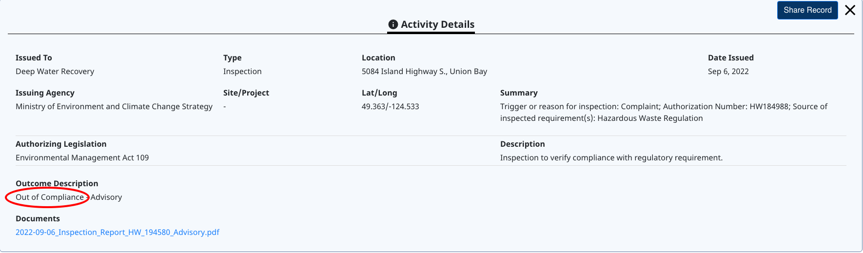 The owner of the site, Deep Water Recovery Ltd., says it has never been shown test results that say it was out of compliance under provincial environmental regulations and that it has done nothing wrong under B.C.’s laws.
