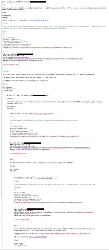 The email chain below begins Jan. 11, 2023, after checking the CVRD website re Union Bay Estates https://www.comoxvalleyrd.ca/projects-initiatives/past-current-projects/union-bay-estates I could not find any development permit for the pathway that was being constructed along the shoreline. I provided video and photos.