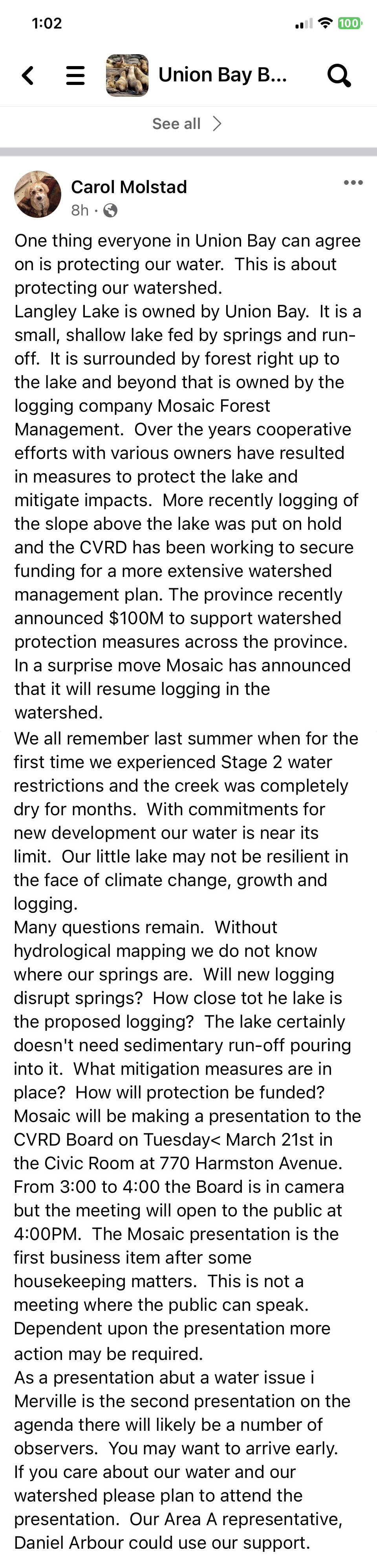 Area A Director, CVRD, Water Logging in our watershed – Meeting Mar. 21, Mosaic making a presentation to CVRD Board. DCIM100MEDIADJI_0088.JPG Date: March 18, 2023Author: allthingsunionbay 0 Comments Thanks to Carol Molstad for bringing attention to this important meeting. https://cvrdagendaminutes.comoxvalleyrd.ca/CVRDAgendas/default.aspx?MeetingID=3737&PrinterVersion=0&DocumentTypeID=1&AgendaDeadline=3/17/2023%203%3A09%3A18%20PM Share this: Click to share on X (Opens in new window) X Click to email a link to a friend (Opens in new window) Email Click to share on Facebook (Opens in new window) Facebook Click to print (Opens in new window) Print Like Loading...