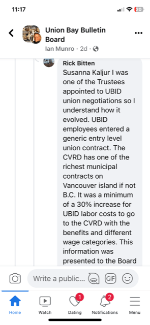 UPDATE: So his complaint now is the increase in pay his friends/past UBID employees received when they accepted the offer to join the Regional District when UBID was dissolved. Before it was his concern about what would happen to the employees if we became a service area. Sure changed his tune. How do those folks feel about his sour grapes due to their increased income? Wasn’t he your champion? With the huge costs we are going to be facing due to lack of planning on the part of UBID – the 4 or 5 employees wages are going to be a drop in the bucket compared to infrastructure costs. That’s his main complaint regarding the increases we are facing – nice effort at deflection. The gong show board screwed the future of Union Bay because they were led around by the nose by Kensington Island Properties – useful idiots. They negotiated down ffs in the 2017 Water Agreement! Who negotiates down and then struts around proclaiming a great deal? And, they built the bloody water treatment plant without an office or washroom. Landowners were stuck with that additional cost due to incompetence of the gong show board and the unqualified admin that oversaw the project. Own it!