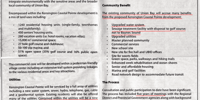 Area A Director, CVRD, Government, Kensington Coastal Pointe, Kensington Island Properties aka KIP Costanza, 34083 Yukon Inc., Kensington Union Bay Properties Gp Ltd, Kensington Union Bay Properties Ltd., Kipshit Creek, Royston Union Bay Sewage plan 2020, Sewer Extension South, Sewer Extension South Project, south sewer project, The Union Bay Community, Union Bay Estates, Union Bay Resorts