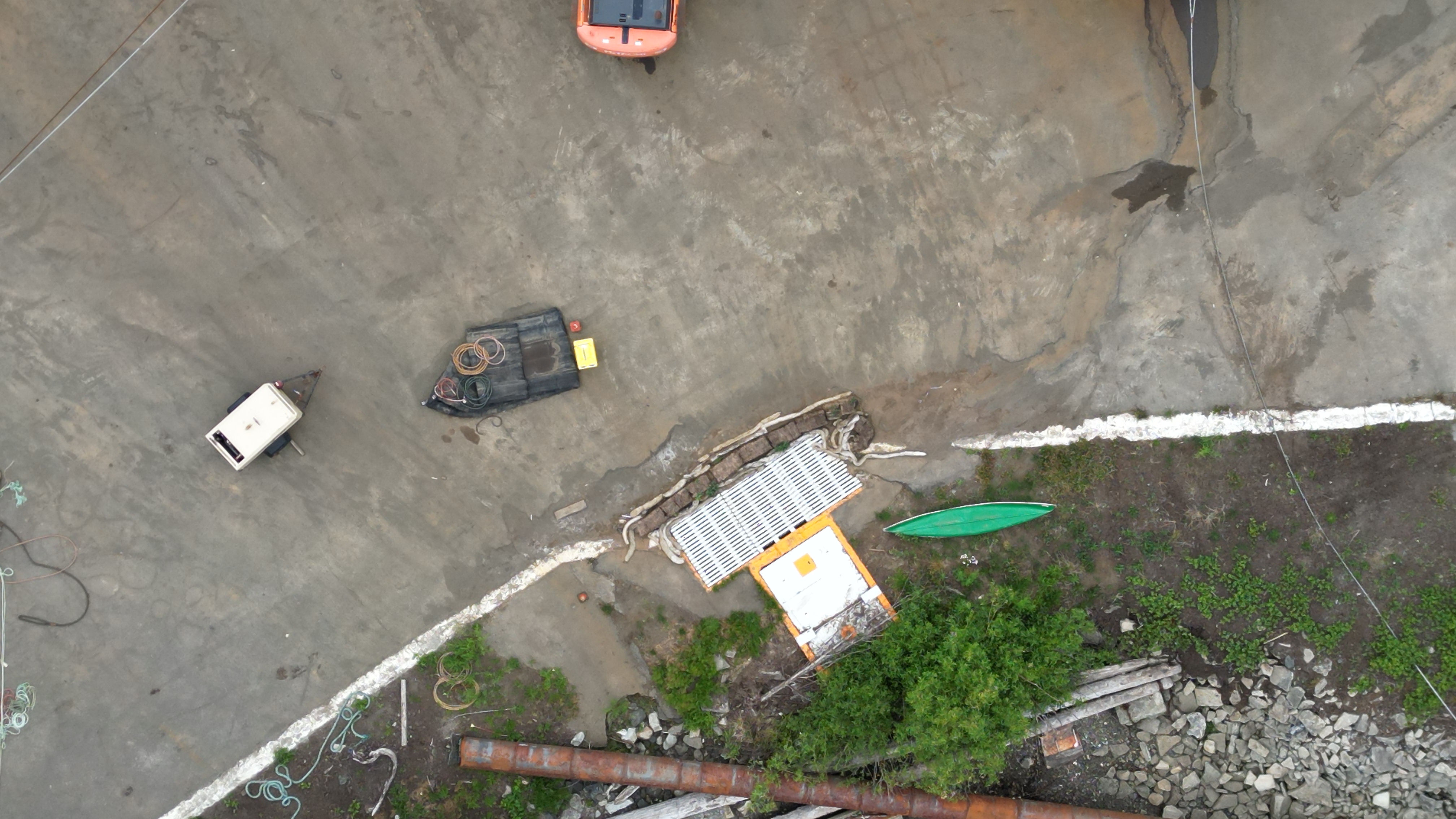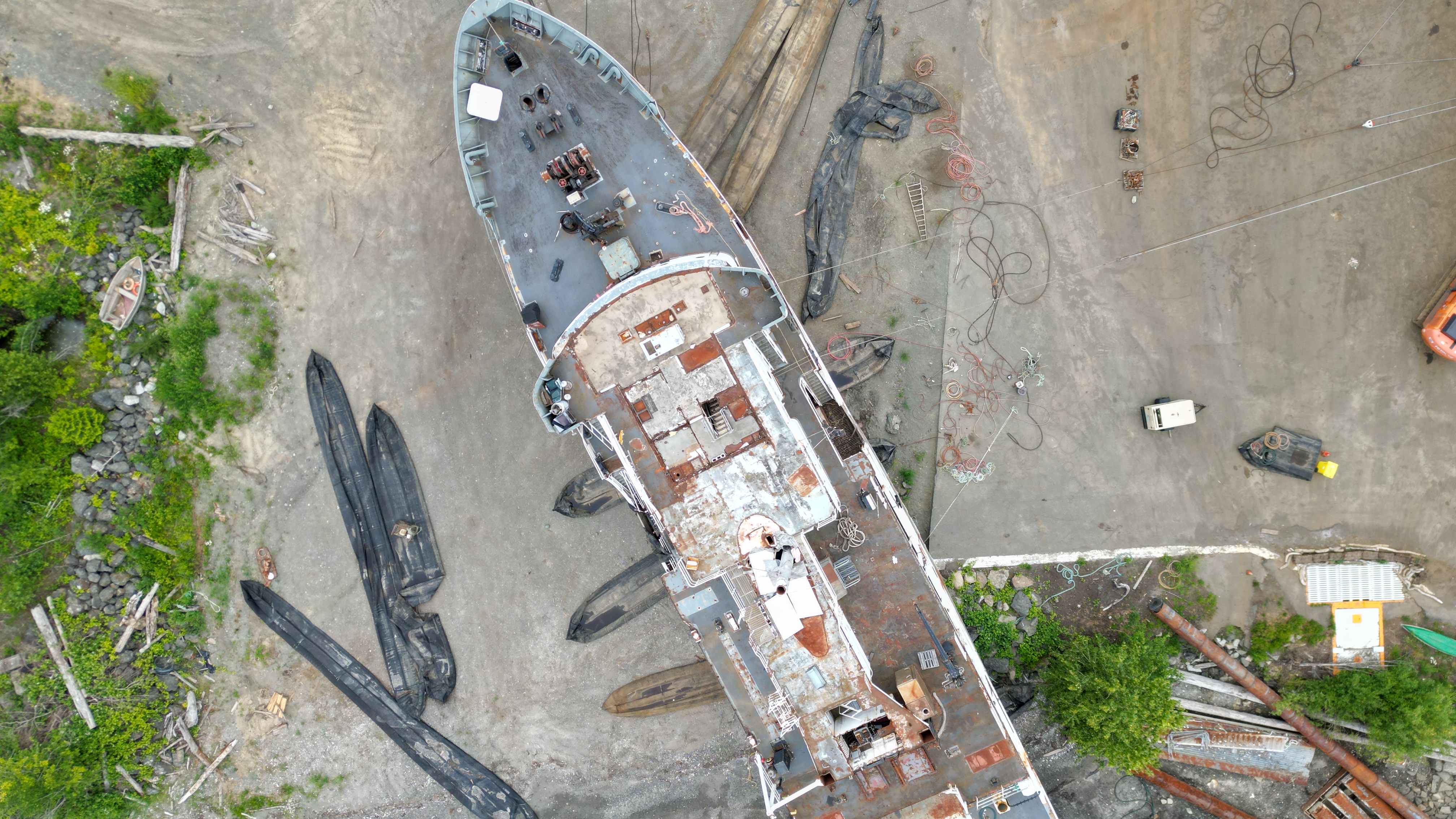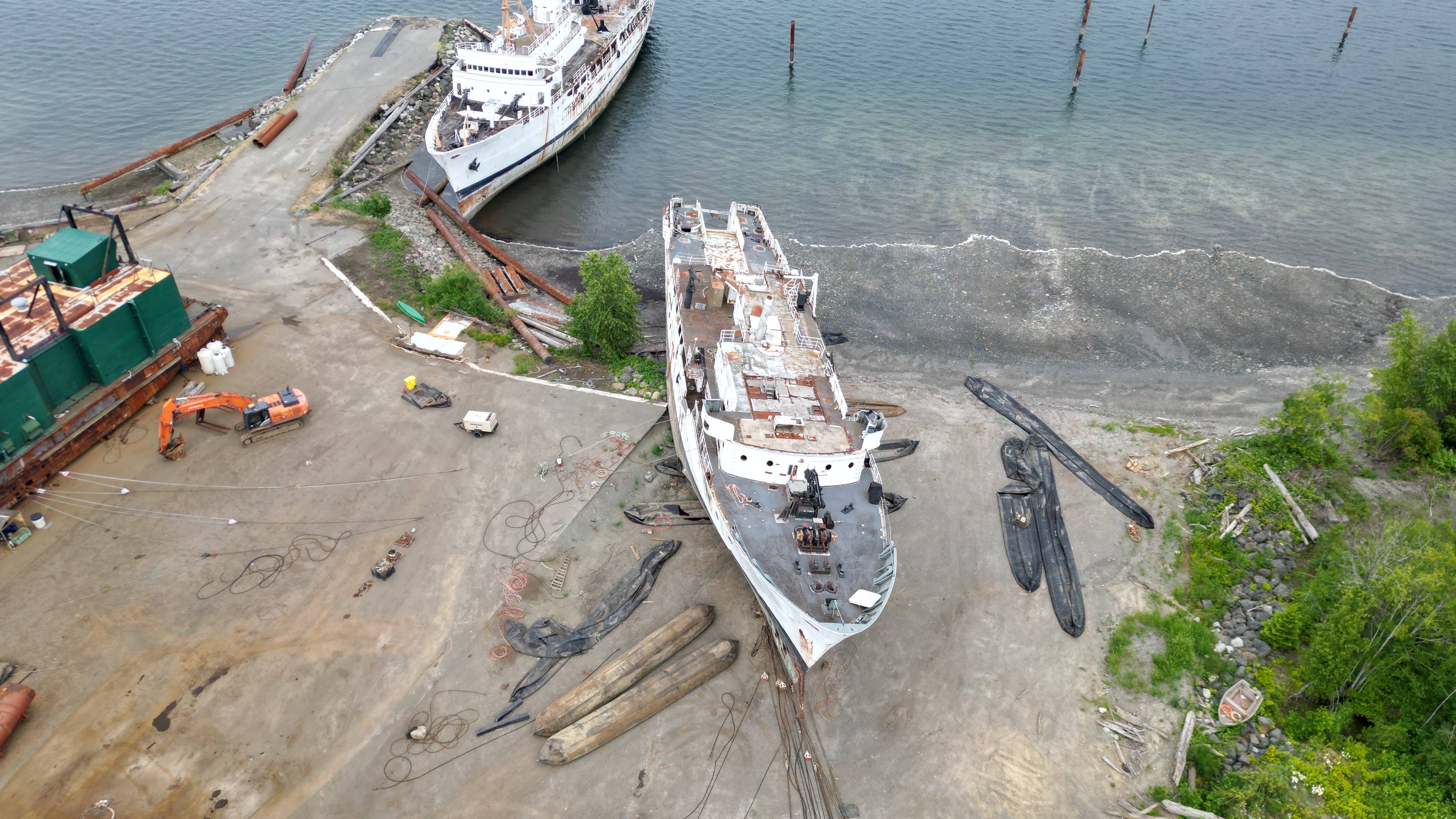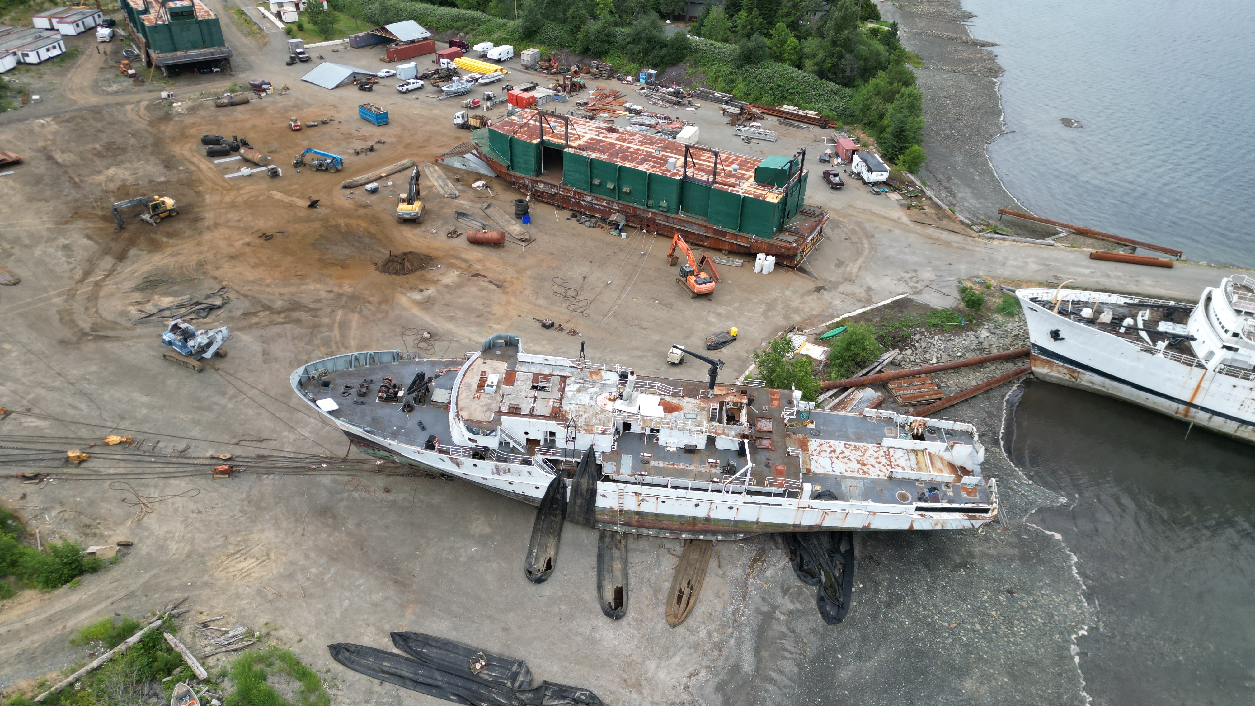 Filtration system still filthy hay bales. All pics below from today, June 15, 2023. Miller Freeman still half in half out of the water. Been trying to move it since Aug. 2022. Must be the remedial ship breaking class.