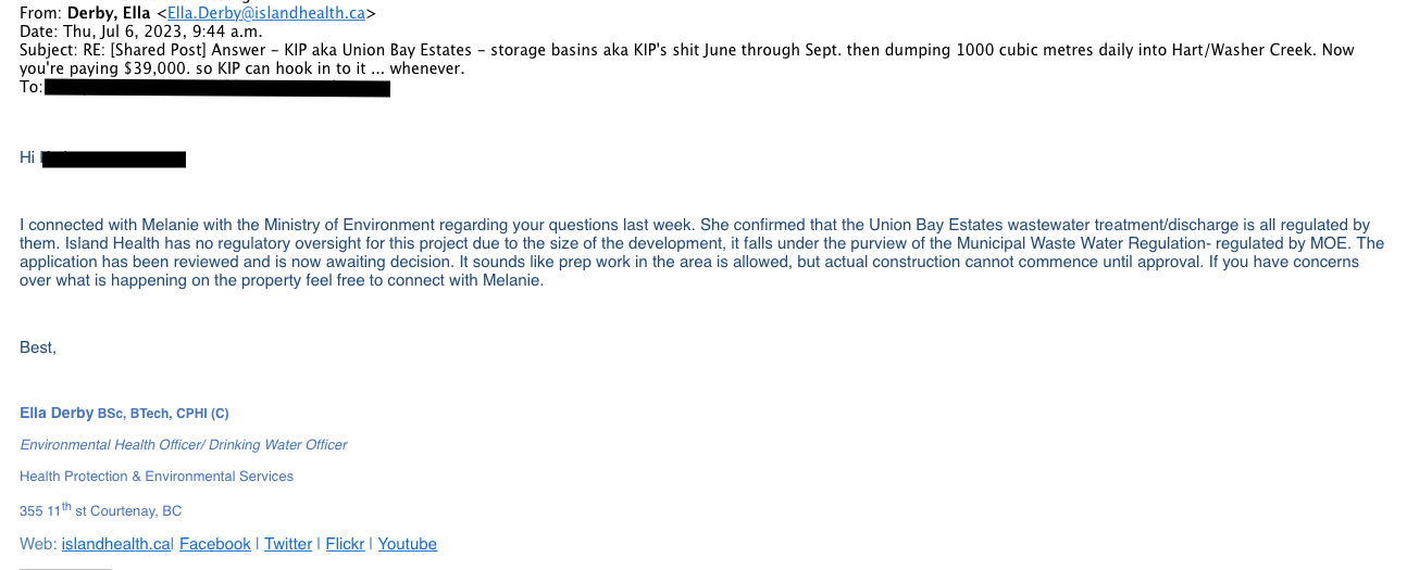 Thanks to the landowner who forwarded me this email. Ole slick must know he’s going to be approved or else he’ll whine and cry about all the work and money spent WITHOUT permits if he’s turned down. How the Ministry can approve dumping anything into Hart/Washer Creek is just ridiculous and with no public input. Island Health has no regulatory oversight – so who’s going to monitor to ensure KIP abides by anything? I sure as hell hope it’s not on the honour system since that is absent with the sleazy developer who spews so much bullshit I had to start a blog to keep track.